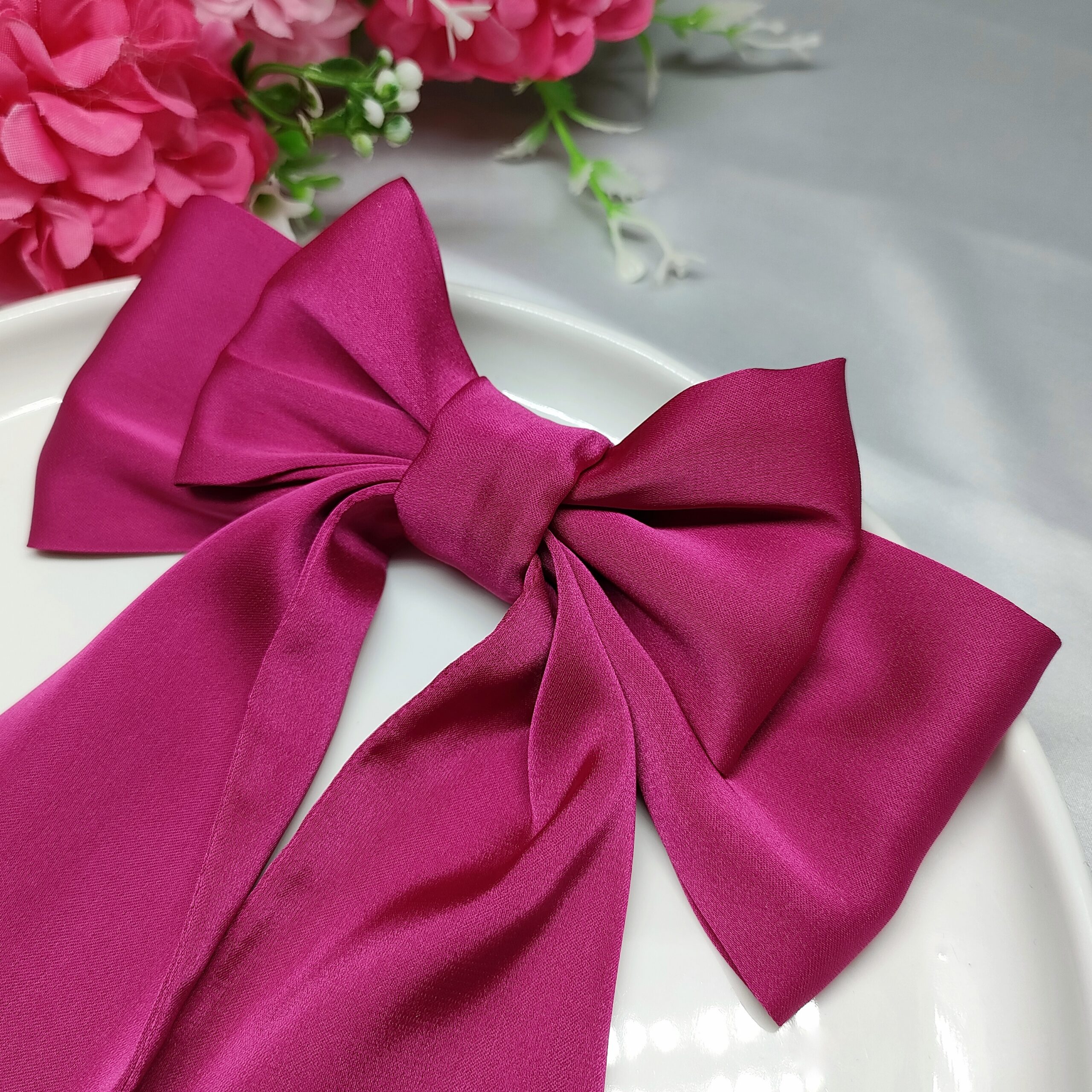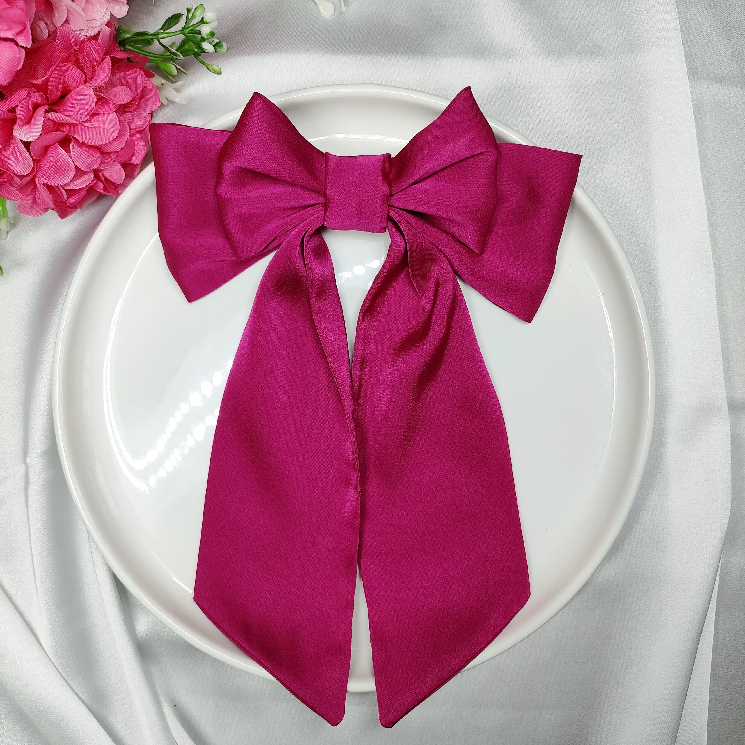 Wykonana z satyny z dodatkiem jedwabiu, jest miękka, delikatna i pięknie układa się na włosach.